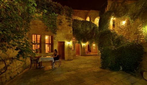 The bedroom has a high arched stone-cut ceiling above a king-size bed, good bedside reading lamps, a small writing and dressing desk, warm-light chandelier, and niches carved in the walls for local antiques, crafts, and books.