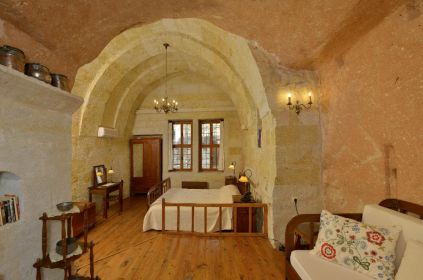 Singles, couples (especially honeymooners) love the quiet and privacy of this cave refuge. The dramatic darkish volcanic stone in the kitchen gives way to golden Esbelli stone in the bedroom, sitting area and bathroom.