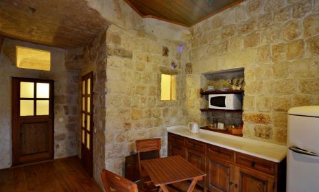 Bu evimiz ismini kaya odalarının önünde yer alan ikiz taş kemerlerden almaktadır. Evimizin iki kaya odası ve mutfağı içerden birbirlerine kilitlenebilir bir kapı ile bağlantılıdır. Her iki odasının ve mutfağının evin avlusuna açılan kapıları vardır. Odalardan bir tanesinde çift kişilik büyük karyola, diğerinde ise tek kişilik bir karyola ve oturma grubu vardır. Her iki odanın da ayrı banyosu bulunmaktadır. Evde yemek yapmak için tam donanımlı bir mutfak bulunmaktadır. Arabanız için evin girişinde özel park yeri vardır.